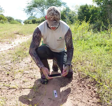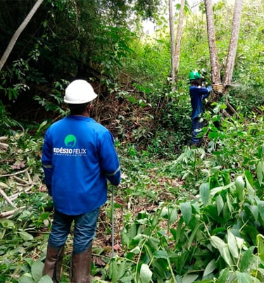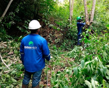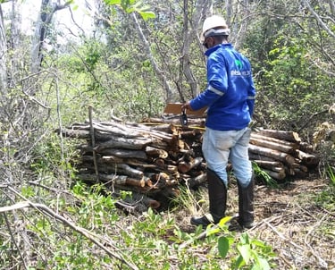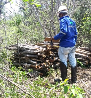 Cubagem de Material Lenhoso: Durante a supressão vegetal o profissional orienta os colaboradores a organizar o material lenhoso gerado em "pilhas" para que sejam tiradas as medidas com a finalidade de calcular a volumetria.